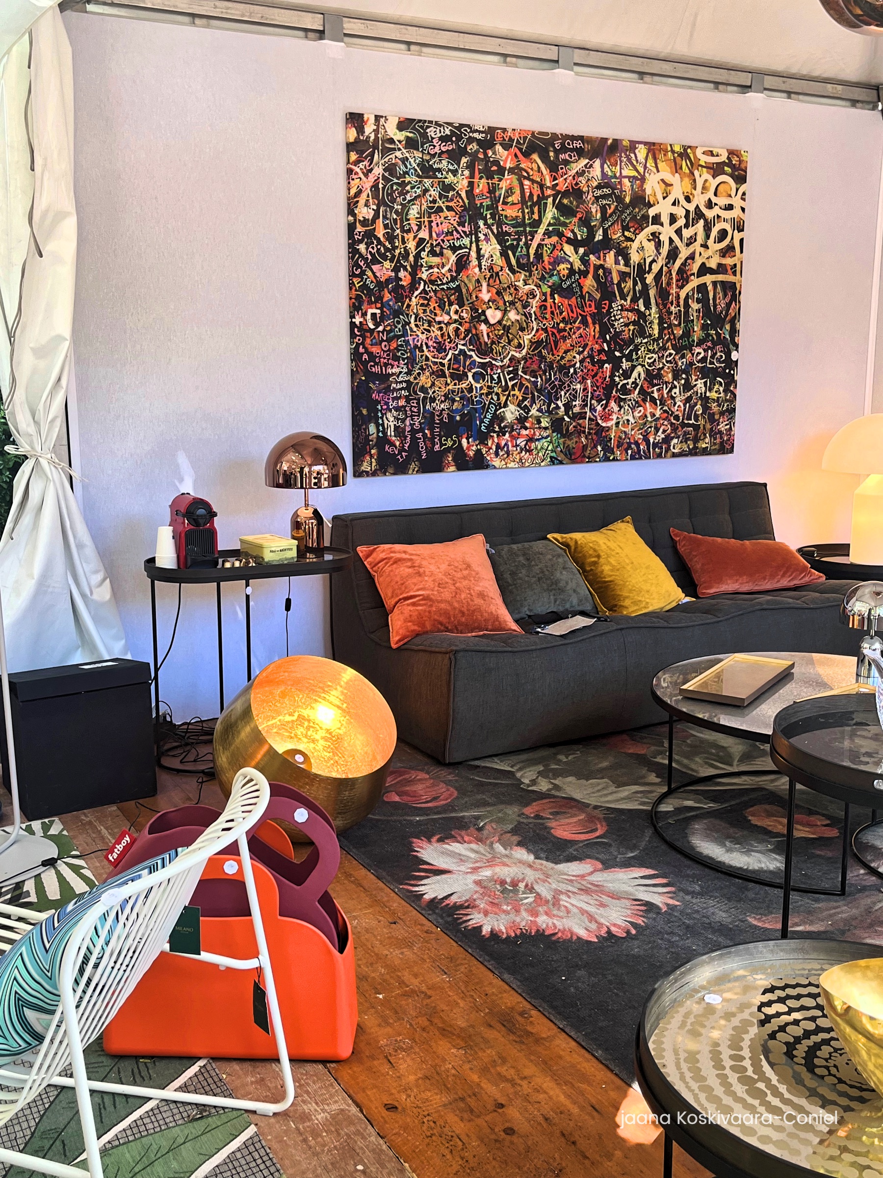 Messuilla oli jo minullekin tutuksi tulleita yrityksiä, joiden tuotteet olivat aseteltu upeasti esille. Kaikilla esille asettajille oli samanlaiset telttakatokset ja samanlainen nimikyltti firman omalla nimellä kertoi kuka kukin oli. Messuilla pidettiin tarkkaa huolta yhteisestä tyylistä ja kaikenlaiset mainoskyltit olivat kielettyjä. Kävelin tungoksessa ja otin samalla kuvia, kun tarkkailin mitä kaikkea kaunista ja mielenkiintoista sisustukseen liittyvää oli myynnissä. Nämä messut oli tarkoitettu, niin ammattilaisille, kuin yksityisillekin kävijöille. Osa yrityksistä esittelivät tuotteitaan ja toiset myivät kaikkea mitä heillä oli tarjolla. Olin taas viisaasti ottanut pyörillä kulkevan ostoskassini mukaan, jota Paul nyt veti perässään.
